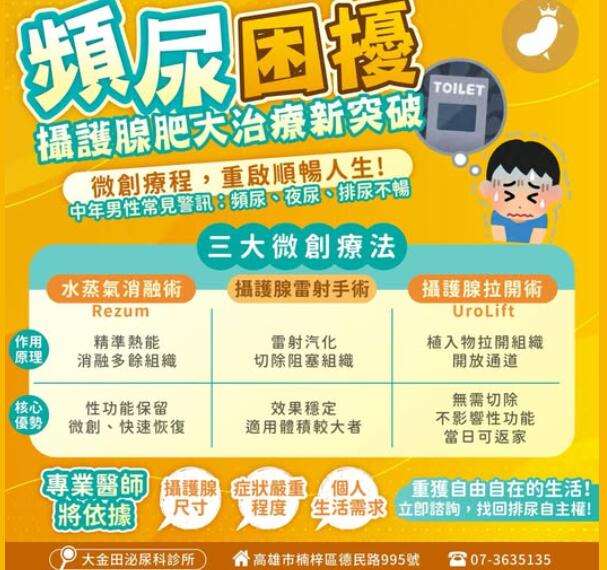 攝護腺肥大是中年以上男性常見的泌尿問題,出現頻尿、夜尿、急尿、排尿困難等症狀時,除了藥物治療外,微創手術也是有效的選項